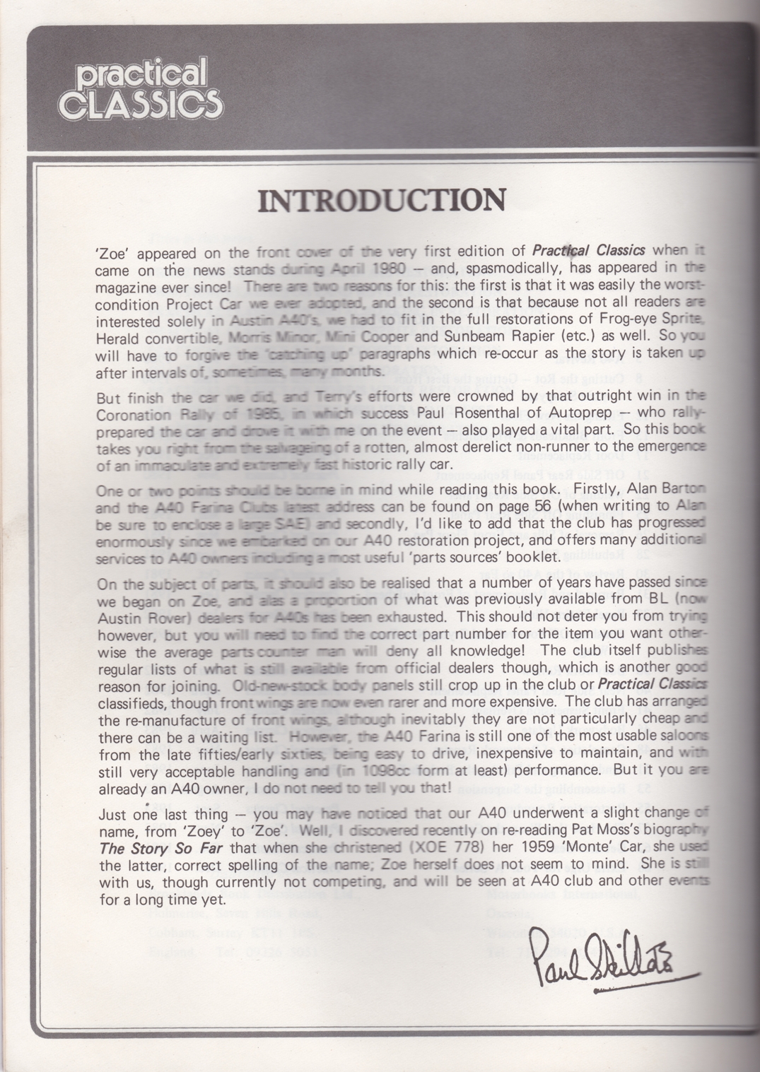 I bought the Practical Classics and Car Restorer A40 restoration booklet when it was first published. It showed the extensive restoration that was carried out over a number of years and the booklet's introduction made great mention of our club. It also stated the the first edition of Practical Classics, April 1980, had a picture of ZOE on the front cover. I've attached a couple of scanned images, sorry about the quality of the introduction page.