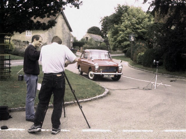And after the static 'shoot it was time for the action pictures. "Just drive steadily along this deserted piece of country lane and ignore us as we keep station off your rear bumper but on the wrong side of the road. And for goodness sake, don't brake," came the instructions. Yes well, easily said. Appearing to be nonchalant while the reflection in my driver's wing mirror shows a mad photographer hanging out of the passenger window of the chase car ain't too easy, I can tell you. Worse was to come. At the end of the two mile lane our mini-convoy turned round and I was alarmed to find Tony preparing to scramble into the Austin's back seat. "Keep your left hand at seven o'clock on the wheel," he commanded, and just drive steadily back to the village." (What's with this "steadily" request - do they think I howl round country lanes like Mr Toad?)
